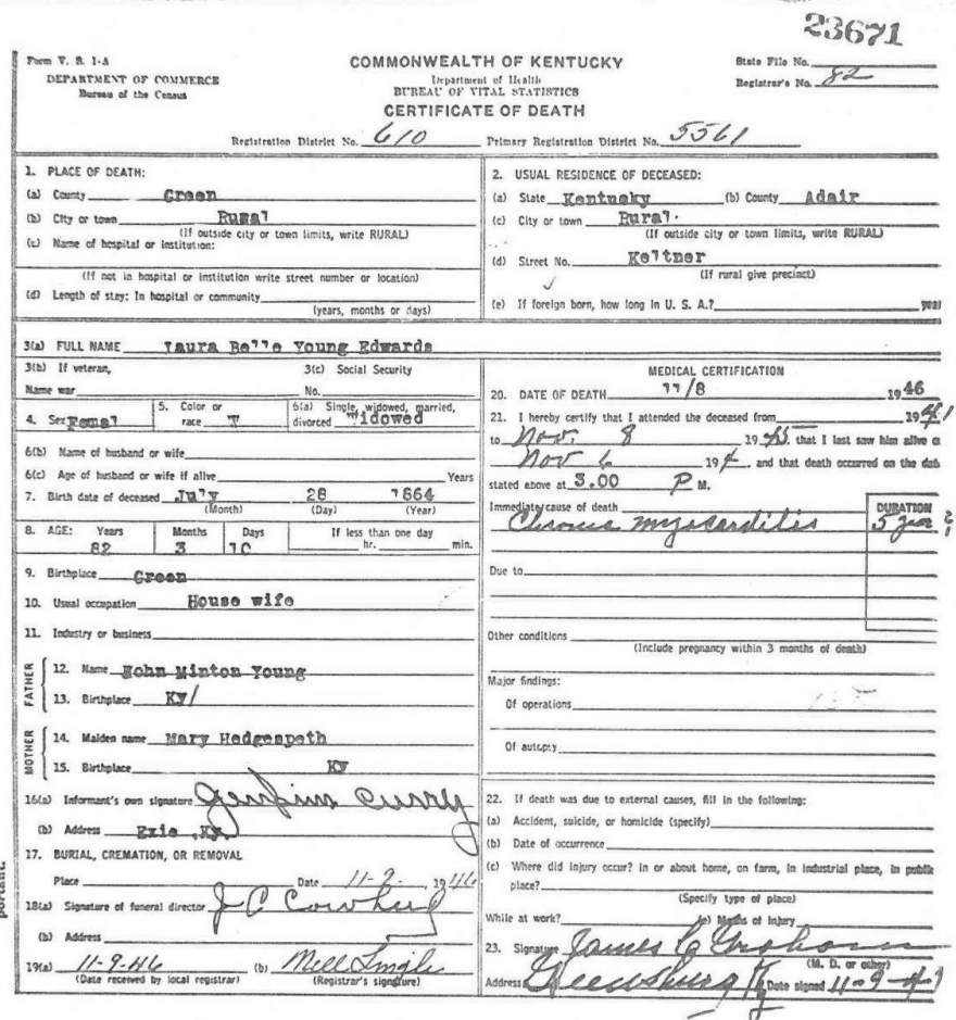 | Edwards, Lura Bell Young | provided by Green Co. Genealogical Society | |||
