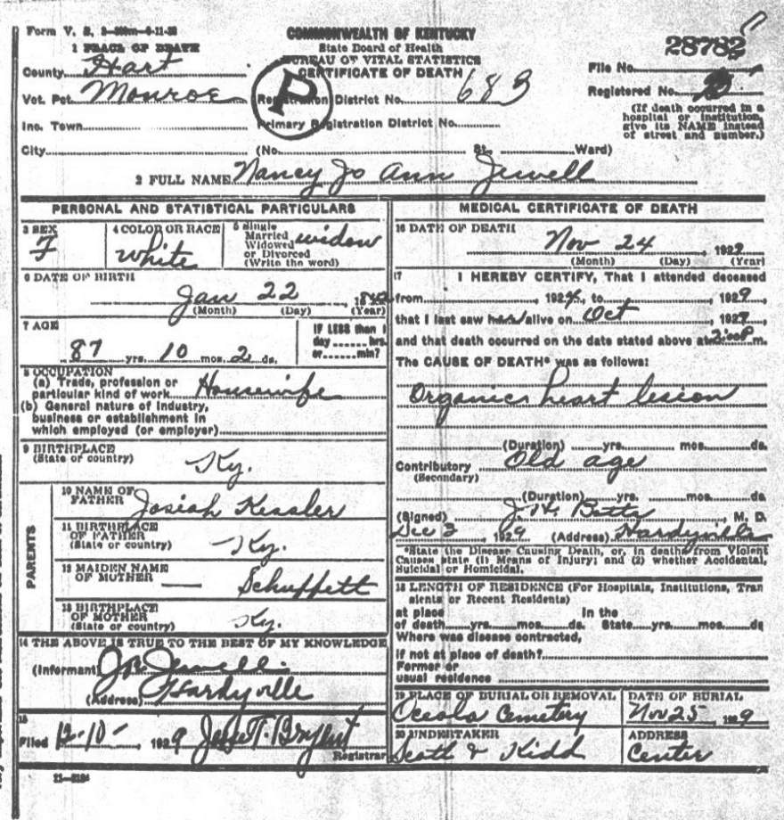 | Jewell, Nancy Jo Ann | provided by Green Co. Genealogical Society | |||