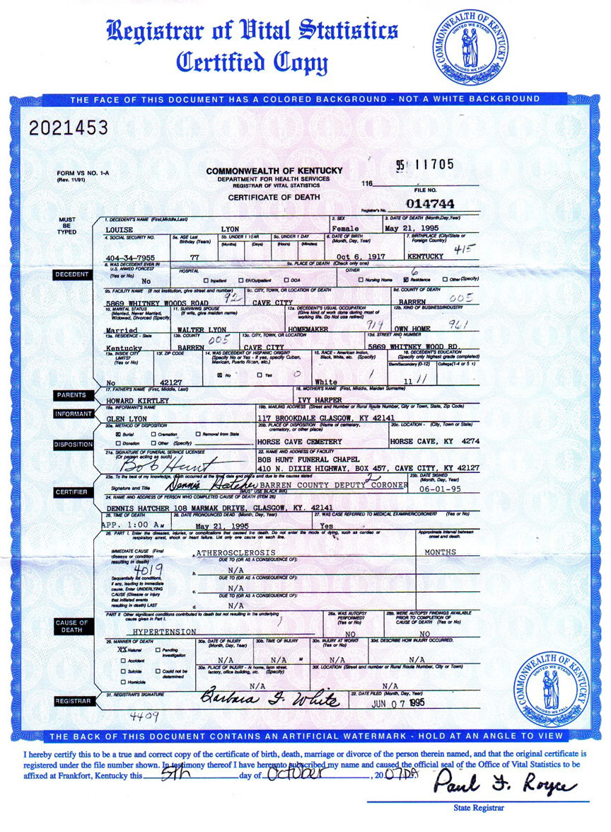 Lyon, Louise Kirtley, Death Cert