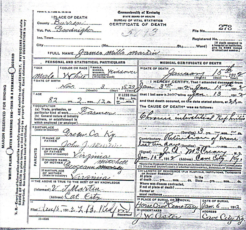 | James Mills Martin was the father of John William Martin, who was the father to Ray Martin, grandfather of Sandra Kay O'Banion. James Mills Martin served on the Union side during the Civil War. He mustered in at Camp Wood in Munfordville in 1861 or 1862 & served until 1865 when discharged in Victoria, Texas |