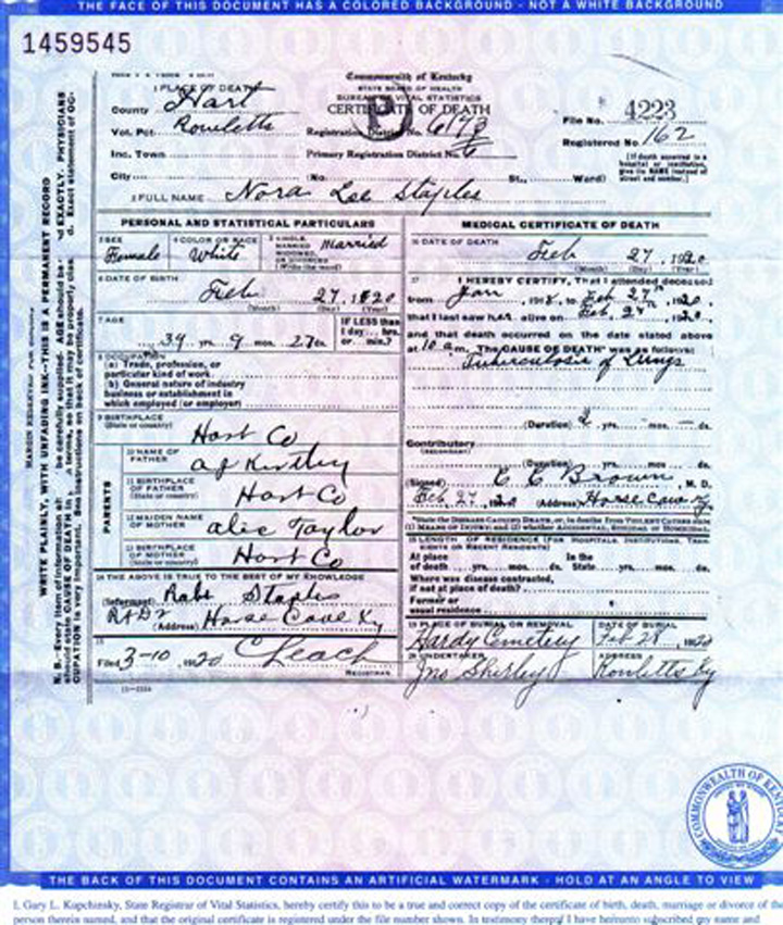 Nora Lee Kirtley Staples was daughter of Andrew Jackson Kirtley & Alice Taylor Kirtley.