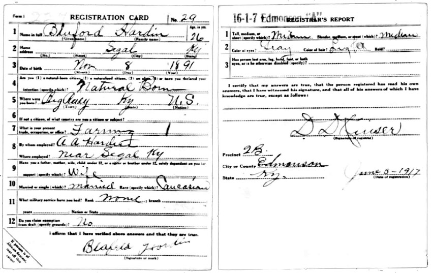 | Hardin, Bluford | WWI | Draft Card | Sheila Wisdom-Hardin |