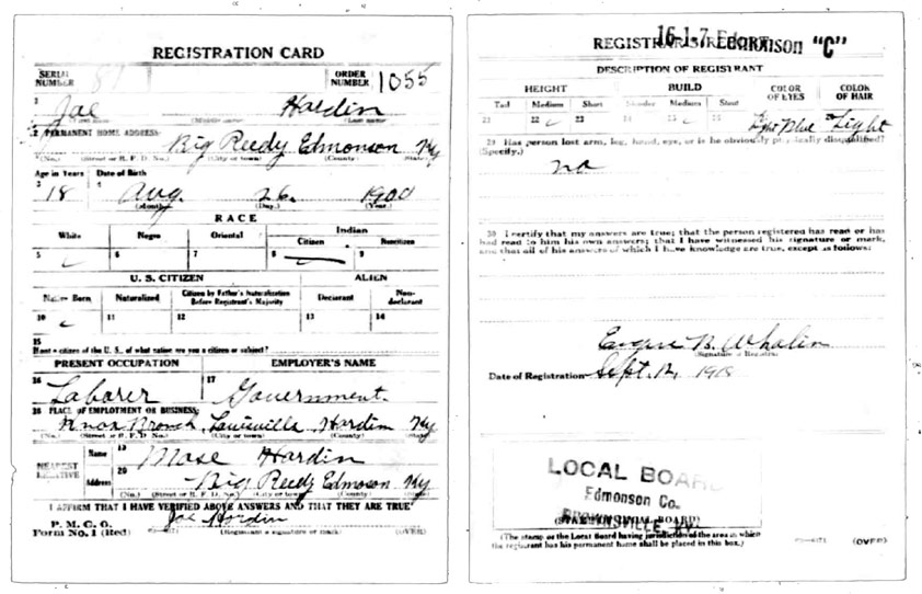 | Hardin, James Ray(Son Of Ben) | WWI | Draft Card | Sheila Wisdom-Hardin |