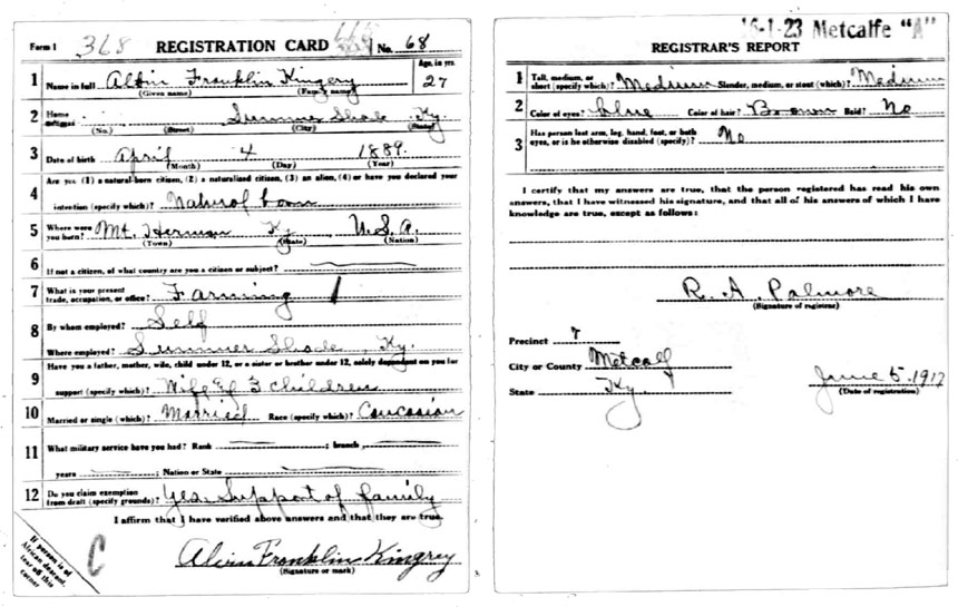 | Kingery, Albin Franklin | WWI | Draft Card | Sheila Wisdom-Hardin |