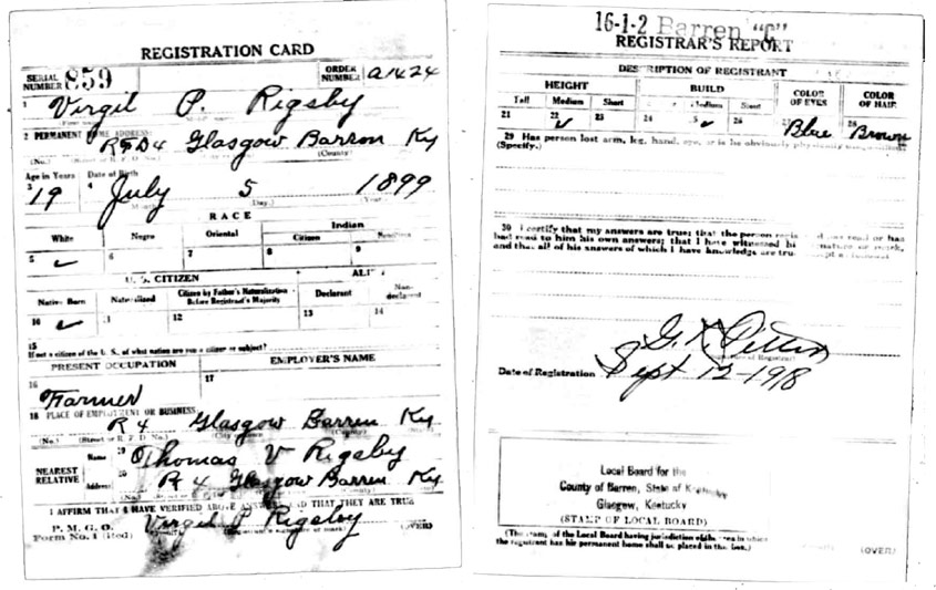 | Rigsby, Virgle Porter | WWI | Draft Card | Sheila Wisdom-Hardin |