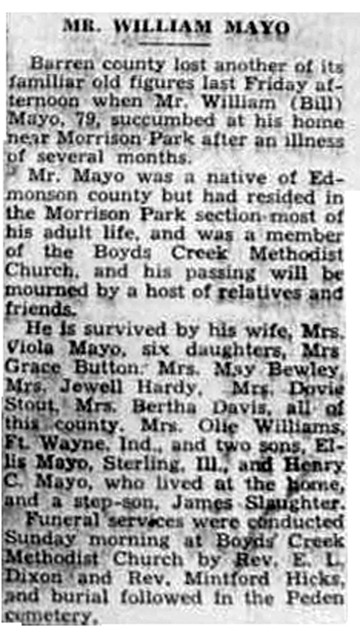 MR. WILLIAM MAYO Barren county lost another of its familiar old figures last Friday afternoon when Mr. William (Bill) Mayo. 79. succumbed at his home near Morrison Park after an illness of several months. Mr. Mayo was a native of Edmonson county but had resided in the Morrison Park section most of his adult life. and was a member of the Boyd’s Creek Methodist Church . and his passing will be mourned by a host of relatives and friends. He is survived by his wife, Mrs. Viola Mayo, six daughters Mrs. Grace Button. Mrs. May Bewley, Mrs. Jewell Hardy(? Harvey?). Mrs. Dovie Stout, Mrs. Bertha Davis, all of this county. Mrs. Olie Williams, Ft. Wayne, Ind.. and two sons, El lis Mayo, Sterling . Ill., and Henry C. Mayo, who lived at the home, and a step-son, James Slaughter uneral services were conducted Sunday morning at Boyd's Creek Methodist Church by Rev. E. L. Dixon and Rev. Mintford Hicks, and burial followed !n the Peden cemetery |