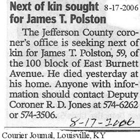 The Jefferson County coroner's office is seeking next of kin for James T. Polston, 59, of the 100 block of East Burnett Avenue. He died yesterday at his home. Anyone with information should contact Deputy Corner R. D. Jones at 502-574-6262 or 502-574-3506."