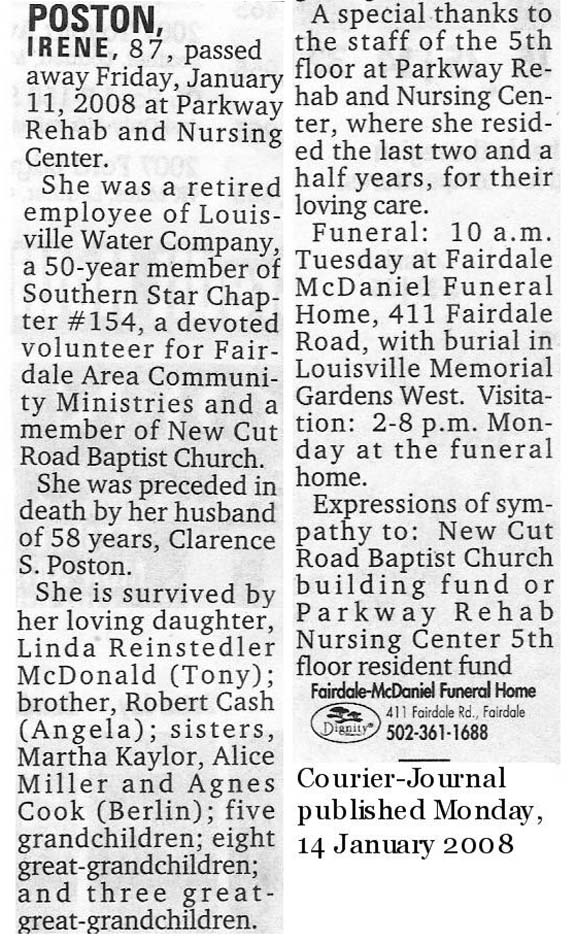POSTON, IRENE, 87, passed away Friday, January 11, 2008 at Parkway Rehab and Nursing Center. She was a retired employee of Louisville Water Company, a 50-year member of Southern Star Chapter #154, a devoted volunteer for Fairdale Area Community Ministries and a member of New Cut Road Baptist Church. She was preceded in death by her husband of 58 years, Clarence S. Poston. She is survived by her loving daughter, Linda Reinstedler McDonald (Tony); brother, Robert Cash (Angela); sisters, Martha Kaylor, Alice Miller and Agnes Cook ( Berlin); five grandchildren; eight great-grandchildren; and three great-great-grandchildren. A special thanks to the staff of the 5th floor at Parkway Rehab and Nursing Center, where she resided the last two and a half years, for their loving care. Funeral: 10 a.m. Tuesday at Fairdale McDaniel Funeral Home, 411 Fairdale Road, with burial in Louisville Memorial Gardens West. Visitation: 2-8 p.m. Monday at the funeral home. Expressions of sympathy to: New Cut Road Baptist Church building fund or Parkway Rehab Nursing Center 5th floor resident fund |