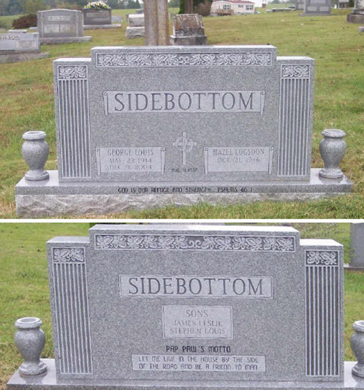 5 Grandchildren: Connie Vincent, Smiths Grove, Mark Sidebottom, Horse Cave, Erin Sidebottom, Mt. Gilead, N.C. , Airman Scott Sidebottom , Kadina Air Force Base Okinawa, Japan, Leslie Anne Sidebottom, Bowling Green