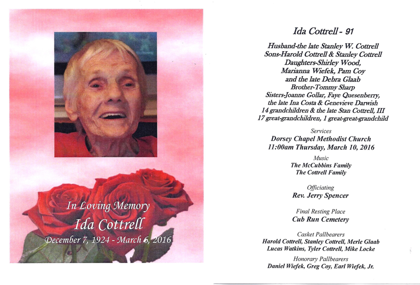 Funeral services for Ida Cottrell will be 11am Thursday at Dorsey Chapel Methodist Church with Rev. Jerry Spencer officiating. Burial will be in the Cub Run Cemetery. Visitation will be Wednesday from 10am-8pm at the Sego Funeral Home and after 9am Thursday at the Dorsey Chapel Methodist Church until time for services.
