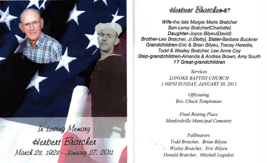 Funeral services for Mr. Herbert Bratcher will be 1pm Sunday at the Lonoke Baptist Church with Bro. Chuck Templeman officiating. Burial will be in the Munfordville Municipal Cemetery. Visitation will be Saturday from 4-8pm and Sunday from 9am-12noon at the Sego Funeral Home. Expressions of sympathy may take the form of donations to the Lonoke Baptist Church Building Fund, donations may be made at the Sego Funeral Home. |