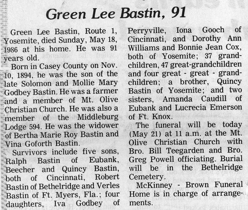 | Bastin, Green Lee | - | - | 05/18/1986 |