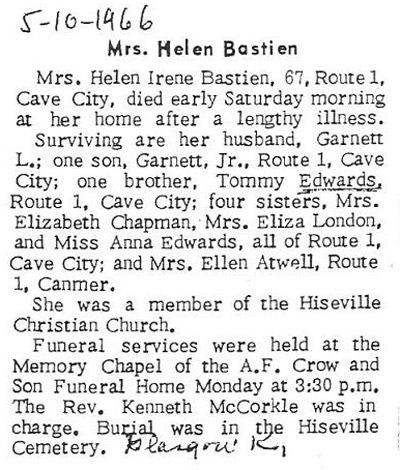 | Bastin, Helen Irene Edwards | - | - | May 1966 |