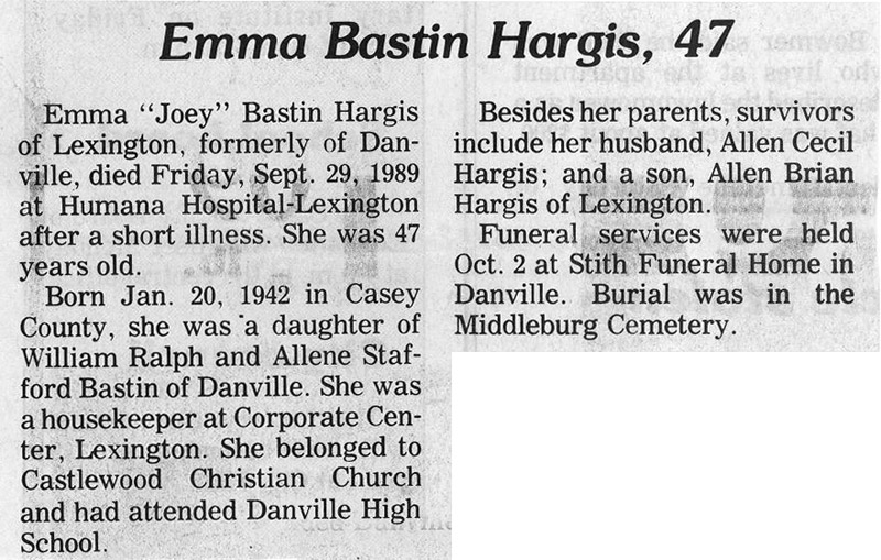 | Hargis, Emma "Joey" Bastin | 09/29/1989 |