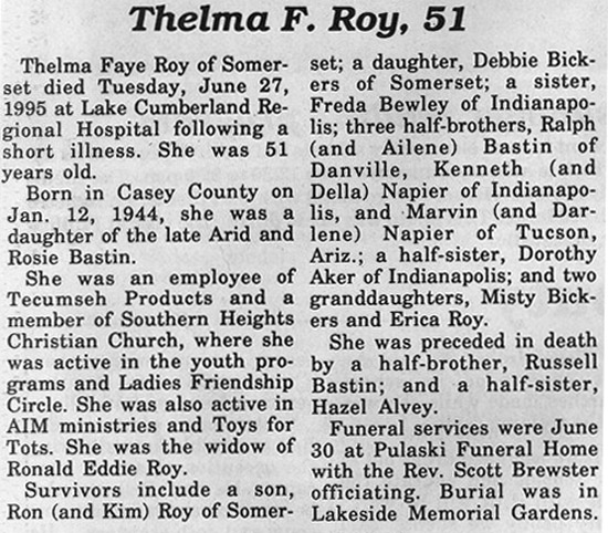 | Roy, Thelma Fay Bastin | 06/27/1995 |