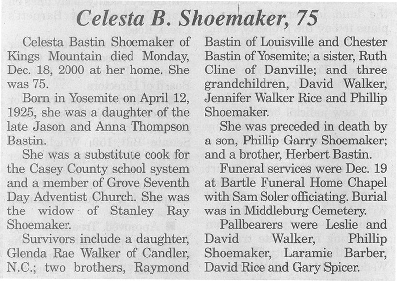 | Shoemaker, Celesta Bastin | 12/18/2000 |