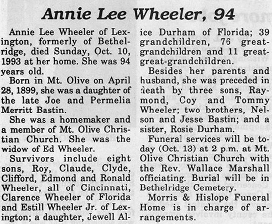 | Wheeler, Annie Lee Bastin | 10/10/1993 |