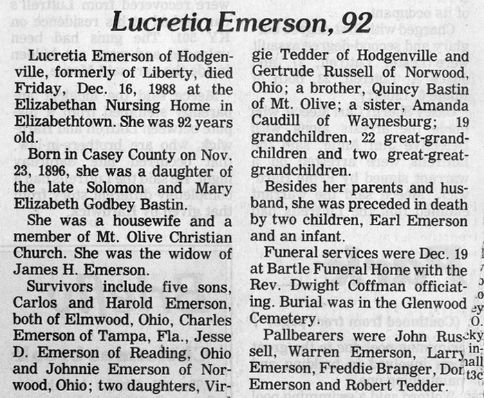 | Emerson, Lucretia Bastin | 12/16/1988 |