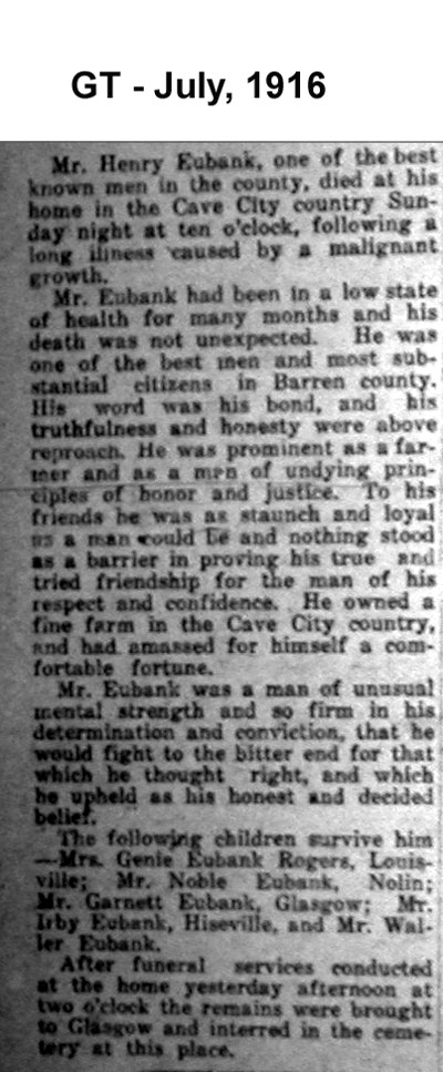 Mr. Eubank had been in a low state of health for many months and his death was not unexpected. He was one of the best men and most substantial citizens in Barren County. His word was his bond, and his truthfulness and honesty above reproach. He was prominent as a farmer and as a man of undying principles of honor and justice. To his friends he was as staunch and loyal as a man could be and nothing stood as a barrier in proving his true and tried friendship for the man of his respect and confidence. He owned a fine farm in the Cave City country, and had amassed for himself a comfortable fortune.