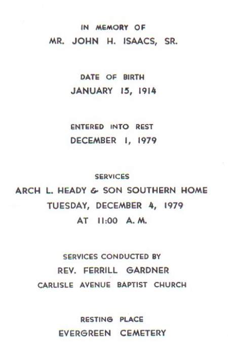 | Isaacs, John H, Funeral Card | Sandra K. O'Banion | ||||