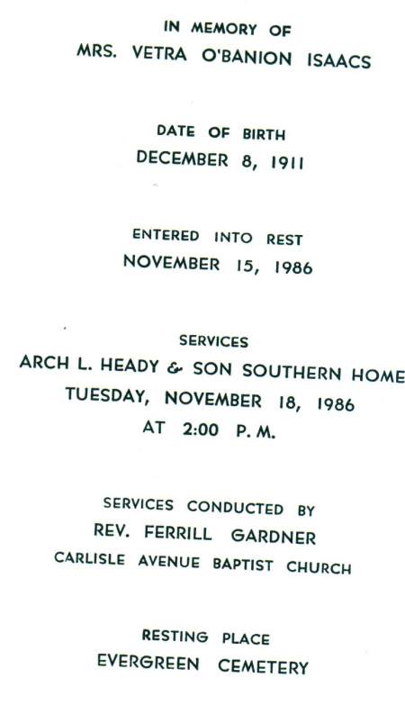 | Isaacs, Vetra O’Banion, Funeral Card | Sandra K. O'Banion | ||||