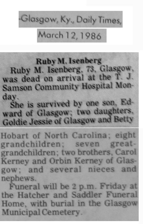 Ruby was the daughter of Jim & Lizzie Kerney. Ruby married Ewing Isenberg Aug 7, 1931. Ewing was the son of Luther Burl & Hettie B. Thompson Isenberg.