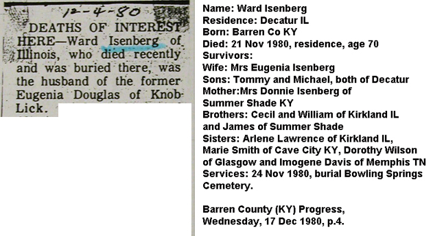 Ward Thomas Isenberg, Born Barren County, KY. Sept 22, 1910. Son of Elzie Creed and Donnie Isenberg. Farmer, WWll War Worker, Tool and Diemaker. Married Eugenia Douglas June 27, 1941. Father of Thomas Douglas Isenberg born Charleston, WV June 6, 1943 and Michael Ray Isenberg born Barren County, KY November 5 1949. Ward was a talented athlete, set the National Record for High School Basketball points scored in 1929. Retired from Caterpillar Tractor Co 1975. Died November 22, 1980.