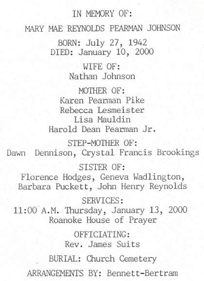 | Johnson, Mary Mae Reynolds Pearman | 01/10/2000 | E. Bastin |