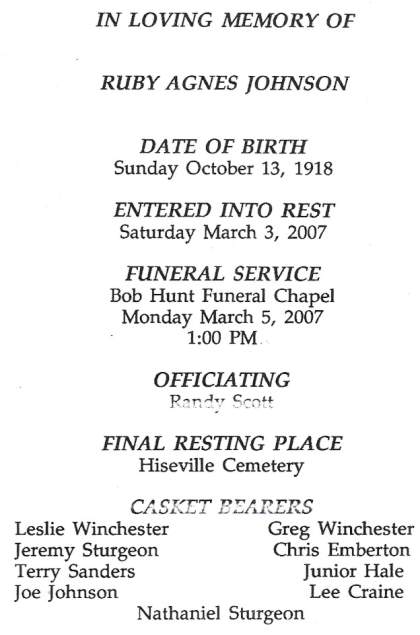 | Johnson, Ruby Agnes | 03/03/2007 | E. Bastin |