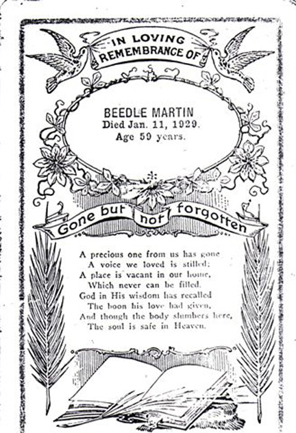 Beedle was the nickname of my great grandfather, John William Martin. He died January 11, 1929. He & his wife, Mary Jane "Mollie" Devore Martin had children: William Daniel Martin, Henry Cecil Martin, Ray Martin, Earl Martin, Joe Bradley Martin, Zelma Nel Martin Brooks, Leo "Buster" Martin, Roscoe Martin, Emery Price Martin, Lawrence Rosezell Martin (died in infancy), Mary Elizabeth Martin (died in infancy), & Dorothy Mae Martin Estes. |