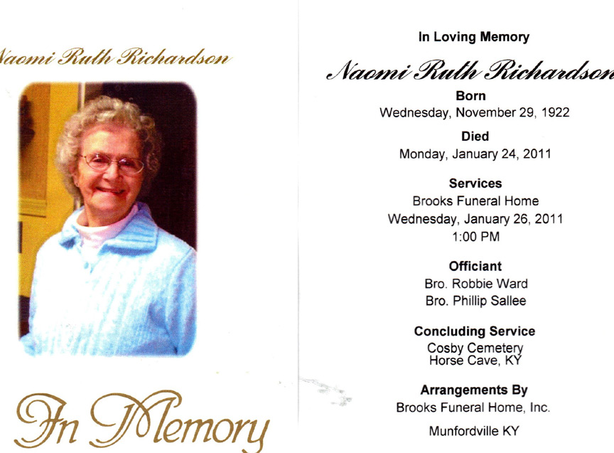 Naomi Ruth Richardson, age 88, of Horse Cave, KY, passed away Monday, January 24, 2011. She was formerly employed by National Seating and was a member of Pleasant Valley Baptist Church. She was the daughter of the late David Ferren and the late Ruth London Ferren. She is survived by one daughter: Mary Jo Gonterman (Leroy), Cave City, KY; two sons: Roger Richardson (Margaret), Glasgow, KY, Ricky Richardson (Debbie), Canmer, KY; ten grandchildren, fourteen great-grandchildren and one great-great-grandchild. Besides her parents, she was preceded in death by a daughter, Joyce Walsh and two sisters, Christine Sallee and Greathel Coffey. Arrangements are being handled by Brooks Funeral Home where the family will receive friends from 1:00 PM to 8:00 PM, Tuesday, January 25, 2011 and from 9:00 AM to 1:00 PM, Wednesday, January 26, 2011. Funeral service will be at Brooks Funeral Home at 1:00 PM, Wednesday, January 26, 2011, Bro. Phillip Sallee and Bro. Robbie Ward officiating. Interment will be at Cosby Cemetery, Horse Cave, KY |
