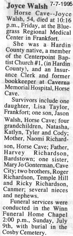 | Walsh, Joyce Richardson, Obit | Sandra K. O'Banion |