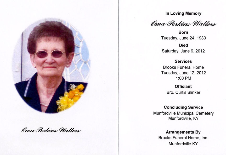 Oma Perkins Walters, age 81, of Munfordville, KY, passed away at 1:22 AM CT Saturday, June 9, 2012, at T. J. Samson Community Hospital in Glasgow, KY. The Hart County native was born June 24, 1930. She was a homemaker and a member of the Wilkerson Temple United Methodist Church. She was the daughter of the late Lewis Thad Perkins and the late Lillie Florence (Reynolds) Perkins. She was the wife of the late Carl Walters.