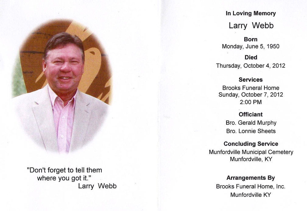 | Larry Webb, age 62, of Munfordville, KY, passed away Thursday, October 4, 2012, at T. J. Samson Community Hospital in Glasgow, KY. He was employed by Woodmen of the World, a member of the Caveland Country Club and Woodman Lodge 939. He was a US Navy veteran and a Baptist. He was the son of the late Rev. J. W. Webb and the late Ella Webb. He is survived by his wife: Marsha Stinson Webb; three daughters: Natalie N. Webb (Bradley P. Williams), Glasgow, KY, Abby L. Cook (Brandon C.), Munfordville, KY, Ashley L. Lowe (Andrew W.), Clarksville, TN; two brothers: Danny W. Webb, Glasgow, KY, James M. Webb, Junction City, KS; two grandchildren: Annika L. Lowe, Anderson W. Lowe. Besides his parents, he was preceded in death by two grandsons: Zachariah Cook and Christian Cook as well as two sisters: Patsy Caroline Webb and Diana Webb. The family will receive friends from 10:00 AM to 9:00 PM, Saturday, October 6, 2012 and from 10:00 AM to 2:00 PM, Sunday, October 7, 2012 at Brooks Funeral Home. Funeral service will be 2:00 PM, Sunday, October 7, 2012 at Brooks Funeral Home with Bro. Gerald Murphy and Bro. Lonnie Sheets officiating. Interment will be at Munfordville Municipal Cemetery, Munfordville, KY. Memorial donations can be made to the March of Dimes. |